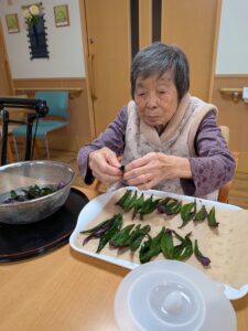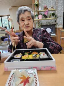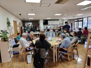準備から入居者の皆様にお手伝いいただき、天ぷらやケーキなどたくさんのごちそうをワイワイとみんなでいただきました。秋晴れの中たくさんのご家族様にご参加いただき誠にありがとうございました。